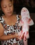 Obvious photoshop. Check out the arm of the lady behind the fish. The color is all wrong and what's that vertical white line where the normal tail would be located?